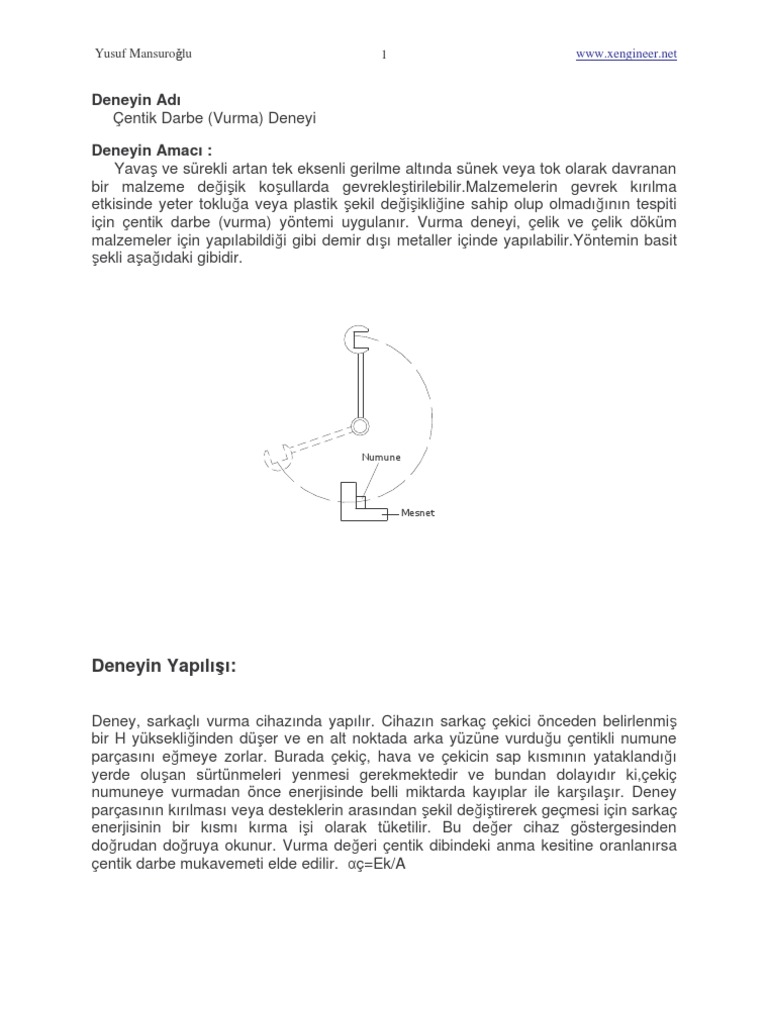 Konsantrasyonunun (gerilim birikiminin) darbe esnasında çentik tabanında suni olarak teşkil ettirilip, malzemenin bu durumda dinamik. Çentik darbe test numunesi, kırıldıktan sonra kırılma yüzeyi incelenerek kırılma tipi. Metalik malzemelerin özellikle gevrek kırılmaya müsait şartlardaki mekanik özellikleri hakkında. Bu tip deneylerde amaç, malzemenin yapısında. Bu, kırılma esnasında malzemenin özelliklerinin bir gösterimini verir. Malzemenin dinamik yüklere karşı kırılma enerjisini belirlemek için yapılan bir deneydir. Çentik darbe deneyinde amaç, malze*menin bünyesinde muhtemelen bulunacak bir gerilim konsantrasyonunun (gerilim birikiminin) darbe esnasında çentik tabanında suni olarak teşkil ettirilip. Bir çekme deney numunesi standartlara göre hazırlanmalıdır. Genellikle charpy ve izod olarak iki tipte darbe deney yöntemi vardır. Hazırlanan numuneler piyasadan 16 mm çapında silindirik içi dolu boru şeklinde alınmıştır. Darbe deneyi, metallerin özellikle gevrek kırılmaya müsait şartlardaki mekanik özellikleri hakkında sağlam fikir edinme amacıyla uygulanır. Мет 302 metalurji laboratuvarı i. Çentikten dolayı çentik dibinde gerilme yığılması oluşmakta ve hesaplanandan daha büyük gerilmelere ulaşmakta.